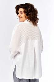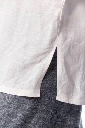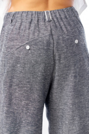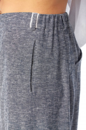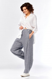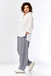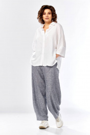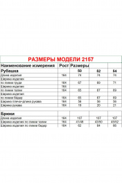 Комплект брючный состоит из рубашки и брюк. Рубашка со спущенным плечом, с застежкой на петли и пуговицы. По спинке кокетка, по шву притачивания нижней части заложена складка, по боковым швам-разрезы. Рукав втачной одношовный короткий. Воротник стояче-отложной с отрезной стойкой. Используются две ткани. Брюки расширенные к низу. На задней половинке-кокетка, обработаны карманы в шве с застежкой на петлю-пуговицу. По переду в рельефном шве бочка обработаны карманы. Застежка на тесьму-молнию, петлю-пуговицу. Верхний срез обработан поясом с резинкой. По поясу-шлёвки. В качестве отделки используется фурнитура, отделочная строчка. Длина по спинке 74 см, ширина плеча+длина рукава 56 см. Длина брюк 107 см.