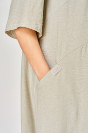 Платье женское свободного кроя . Спинка со средним швом и полукруглым подрезом в области талии. Перед с V-образной горловиной и полукруглым подрезом в области талии. В нижней части переда и спинки сборка в центральной части . Боковые карманы обработаны в шве подреза переда. Правый карман украшен нашивкой. Рукав втачной одношовный длиной до локтя. Фурнитура может отличаться от заявленной на фото. Длина по спинке 125 см, длина рукава 35 см.