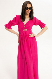 Летнее длинное платье в модном розовом цвете. Вырез горловины V-образной формы. Рукава "фонарики". На груди декоративная завязка. Длина платья 150 см