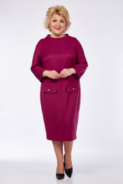 Платье женское полуприлегающего силуэта. Вырез горловины круглый со стойкой. Рукав втачной ¾ одношовный. По переду декоративные швы и отстрочки. Накладные клапаны с декоративными камнями. Спинка со средним швом, молнией и шлицей.