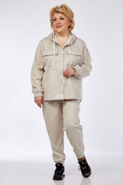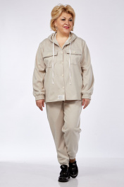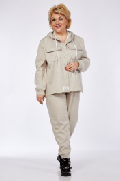 Костюм женский двух предметный, стиль спорт, состоит из бомбера и брюк. Бомбер свободного силуэта с капюшоном. На 5 петлях пуговицах. Рукав вточной на резинке, немного спущен. По переду на груди расположены карманы накладные с клапанами. По бокам бомбера снизу разрезы. Брюки свободные. Пояс на резинке. Низ брюк на резинках. По бокам действующие карманы.
