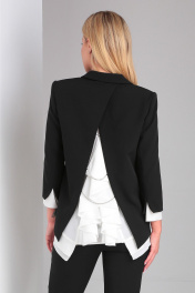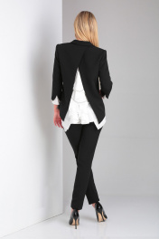 Элегантный брючный костюм в комплекте с шифоновой блузкой.Жакет полуприлегающего силуэта с воротником и лацканами классической формы, застежкой на 1 пуговицу. Особое внимание заслуживает экстравагантная спинка с имитацией запаха и серебристыми металлическими акцентами в виде цепочек, соединяющих две половинки отлетной спинки.Брюки заужены к низу, на поясе со шлевками, которые никогда не выйдут из моды, подчеркнут вашу женственность и добавят дополнительную длину к вашим ногам. Застежка молния спереди. В боковых швах размезы длиной 3 см. Комфортная посадка брюк и подчеркивающий фигуру крой сделает их любимым предметом вашего гардероба. Блузка-туника нежного молочного пастельного оттенка с шифоновыми рукавами. Блуза очаровывает своим красивым непринужденным полуприлегающим силуэтом, фигурной линией низа, и конечно же спинкой.Фантазийная спинка с шифоновыми вставками и воланами, красиво драпирующимися и являющимися одним из популярных трендов, шикарно смотрится как самостоятельно, так и в сочетании с эффектным разрезом на жакете.
