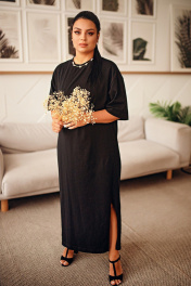 Платье-футболка Dolce Forma (95% вискоза): Идеальная посадка 48+ и максимальный комфорт Представляем платье-футболку от Dolce Forma, созданное для тех, кто ценит практичность, комфорт и безупречный стиль. Сочетание 95% высококачественной вискозы и 5% эластана обеспечивает идеальный баланс: ткань прекрасно драпируется, приятна к телу, сохраняет форму и не сковывает движений. Почему это платье станет вашим фаворитом: • Премиальная ткань: Вискоза дарит ощущение шелковистости, а эластан обеспечивает идеальную посадку и долговечность. • Комфортная посадка 48+: Специально разработанный крой учитывает особенности фигуры, создавая гармоничный и стройный силуэт. Платье мягко облегает, не сдавливая и не подчеркивая лишнее. • Универсальность: Черный цвет — основа любого гардероба. Платье легко трансформируется из повседневного образа в вечерний с помощью аксессуаров. • Практичность: Ткань хорошо пропускает воздух, приятна к телу и проста в уходе. Dolce Forma — уверенность и комфорт в каждом размере.