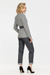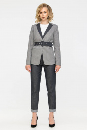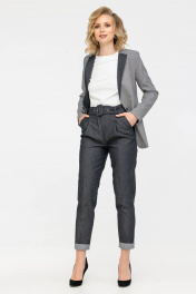 Данная модель - это сочетание разных фактур костюмной вискозной ткани и джинса. Костюм состоит из жакета на подкладке с джинсовой отделкой по лацканам и джинсовых брюк бананов свободного кроя . Пиджак без воротника, а только лишь с лацканами, карманы прорезные "в рамку". Брюки джинсы на притачном поясе со шлевками, что позволяет регулировать талию с помощью ремня или пояса, который идет в комплекте, а так же дополнить им образ, поверх пиджака. На передних половинках брюк обработаны карманы с отрезным бочком, а на задних половинках имитация прорезных карманов. Отлично подойдет как на высокий рост, так и для невысоких. Параметры модели на фото: Ог-86, От-66, Об-95