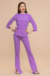 Костюм, состоящий из блузы, расклешенных брюк и пояса с пряжкой. Блуза прямого кроя с рукавами ¾ и застежкой сзади на потайную молнию. Изюминку костюму придают разрезы на рукавах блузы и брюках. Ультрамодные брюки клеш с высокой посадкой на широком притачном поясе зрительно вытягивают силуэт. На задних половинках брюк имитация прорезных карманов. Идеальная посадка на фигуре, модные детали и насыщенные актуальные цвета этого сезона позволяют выглядеть выразительно в любой ситуации. Это беспроигрышный вариант для Вашего неповторимого образа как в классическом варианте, а так же возможность составлять образы с отдельными элементами костюма.