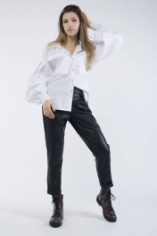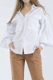 Стильная и нарядная блузка всегда останется в моде независимо от новых идей дизайнеров и модельеров. Блузка идеально подходит для деловых будней, собеседований, свиданий, встреч с подругами, посещений выставок и концертов. Прямой силуэт, боковые разрезы и удлинение по спинке, рукава буф со сборками по окату и вдоль манжет, накладные карманы-портфели, воротник на стойке , центральная застёжка на кнопки - это детали, создающие модный и привлекательный образ.