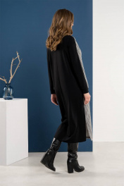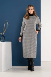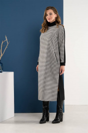 Стильное осеннее трикотажное платье, прямого силуэта, длина миди. Платье по переду в принт гусиная лапка. Рукав спущенный, длинный, по низу на манжете из довяза. Горловина - стойка. По бокам платья функциональные карманы на дизайнерской молнии. По спинке платье выполнено из однотонного трикотажа. Есть средний шов. По бокам платья разрезы. Платье стильное и удобное, отличный вариант для повседневной носки. Длина платья - 126 см. Длина рукава платья от горловины - 73 см.