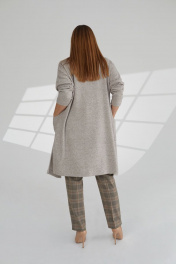 Кардиган выполнен из качественного трикотажного полотна, устойчивого к износу. Изделие с длинным спущенным рукавом и накладными карманами по переду изделия. По борту кардигана цельнокроеный воротник. По бокам изделия функциональные разрезы. Длина кардигана - 97см. Длина рукава - 71см.