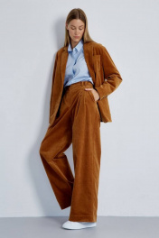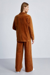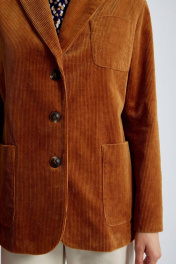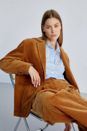 Стильный женский жакет из высококачественного хлопкового вельвета. Английский воротник и накладные карманы гармонично дополняют и завершают дизайн жакета. Застежка на три роговые пуговицы. Рукав со шлицей с имитацией застежки на пугавицы. Средний шов спинки со шлицей. Подкладка из шелковистой вискозной ткани, по контуру подкладки вставлен контрастный кант золотистого цвета, что придает жакету особую изысканность. Отлично сочетается с брюками арт.4460 из осенней коллекции. Длина рукава - 61 см., длина спинки 74 см.