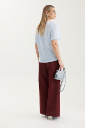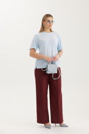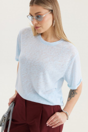 Джемпер из лёгкой поливискозы небесно‑голубого оттенка. Полупрозрачная фактура с деликатным рельефом придаёт модели воздушность и утончённость. Идеально подходит для создания современных образов как в повседневном стиле, так и в более элегантных сочетаниях.