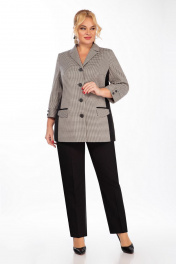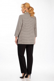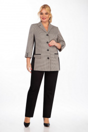 Жакет полуприлегающего силуэта с центральной бортовой застежкой на 4 петли, 4 пуговицы, с отложным воротником пиджачного типа. Полочка обработана подкладкой. По полочкам вертикальные рельефы из отдельной ткани, что зрительно вытягивает силуэт, прорезные карманы с клапанами. Спинка имеет средний шов и кокетку. Рукав втачной, 3/4, двухшовный с притачной манжетой. Длина жакета по спинке 72 см. Длина рукава 48 см