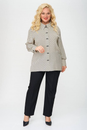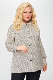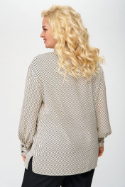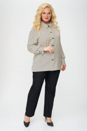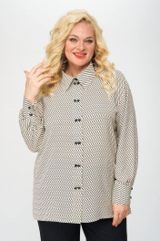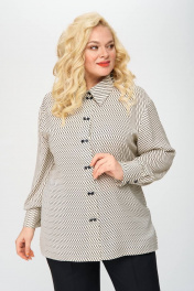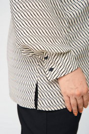 Блуза прямого силуэта из принтованной ткани. По центру полочки застежка в виде планки на миниатюрные пуговицы, что служит декоративным элементом изделия. Воротник стояче-отложной, рукав втачной, внизу обработан притачной манжетой. В боковых швах небольшие разрезы