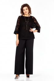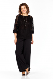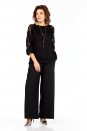 Комплект женский брючный 2-х предметный. Праздничная элегантная блузка полуприлегающего силуэта, выглядит эффектно, прекрасно подойдет для вечерних мероприятий. Горловина аккуратной округлой формы. Рукав выполнен из мягкого кружева, что придает дополнительный шарм, длина 7/8. В боковых швах предусмотрены разрезы. Невероятно комфортные, элегантные брюки-палаццо, образ в котором будет привлекать к себе внимание окружающих. Идеально подходит как для офиса, так и для вечернего выхода. Брюки свободные. По переду заложены складки, в боковых швах расположены боковые карманы, застежка-молния. Пояс притачной, сзади на резинке, это обеспечивает комфортную посадку. Широкий крой палаццо добавляет образу легкость и непринужденность, стрелки визуально удлиняют силуэт.