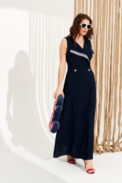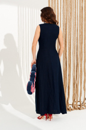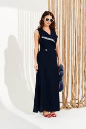 Платье полуприлегающего силуэта, расклешенное книзу, отрезное по линии талии, с V-образным вырезом горловины и лацканами, центральной двубортной застежкой на петли и пуговицы. Правый лацкан оформлен декоративной тесьмой. Перед и спинка с талиевыми вытачками. Спинка со средним швом. Длина изделия на модели вдоль середины спинки — 139 см (допустимое отклонение +/- 1 см)