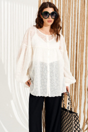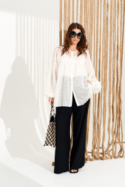 Блузка свободного объема, прямого силуэта, с круглым вырезом горловины и центральной застежкой на петли и пуговицы. Детали переда и спинки с отрезными кокетками. Нижняя деталь спинки со средним швом. По верхнему краю переда и спинки выполнена сборка, выходящая из-под кокетки. Рукав втачной, одношовный, длинный, со сборкой по нижнему срезу. Нижний срез рукава обработан притачной манжетой с застежкой на одну петлю и одну пуговицу. Длина изделия на модели вдоль середины спинки — 71,5 см (допустимое отклонение +/- 1 см)