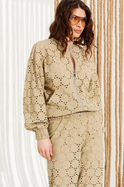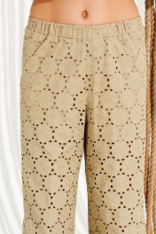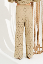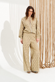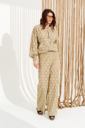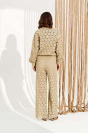 Комплект 2-х предметный, состоящий из блузона и брюк. Блузон свободного объема, прямого силуэта, с центральной застежкой на тесьму-молнию и круглым вырезом горловины, на подкладке. Детали переда с накладными карманами. Спинка цельная. Нижний срез изделия обработан притачным поясом со сборкой на резинку. Рукав втачной, длиной 3/4, одношовный. Нижний срез рукава обработан притачной манжетой со сборкой на резинку. Брюки умеренного объема, прямого силуэта, с отрезным поясом на резинке, частично на подкладке. Длина блузона на модели вдоль середины спинки — 65 см, длина брюк на модели вдоль бокового шва с учетом пояса — 109 см (допустимое отклонение +/- 1 см)