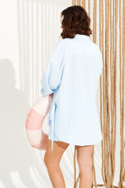 Комплект 2-х предметный, состоящий из блузки и шорт. Блузка свободного объема, прямого силуэта, с фигурной линией низа, центральной застежкой на петли и пуговицы. Горловина оформлена отрезной стойкой. Боковые швы заканчиваются разрезами с декоративными завязками. Рукав втачной, одношовный, длинный. Нижний срез рукава с двумя односторонними складками и разрезом, обработан притачной манжетой с застежкой на одну петлю и одну пуговицу. Шорты умеренного объема, прямого силуэта. В боковых швах расположены карманы. Пояс притачной, на резинке с отделочными строчками, с настрочной декоративной нашивкой по переду. Длина блузки на модели вдоль середины спинки — 80 см, длина шорт на модели вдоль бокового шва с учетом пояса — 39 см (допустимое отклонение +/- 1 см)
