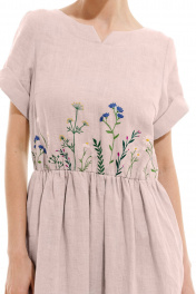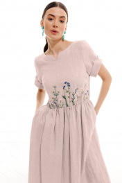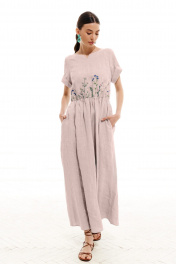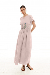 Платье женское, полуприлегающего силуэта, длиной макси из костюмно-плательной ткани. Отрезное по линии талии, для лучшего прилегания по линии талии вставлена резинка. Лиф переда с нагрудными вытачками и декоративной вышивкой. В среднем шве спинки застежка на потайную молнию. Рукав одношовный, втачной, короткий с притачной отложной фигурной манжетой. Горловина круглой формы, с притачной отделочной фигурной планкой.