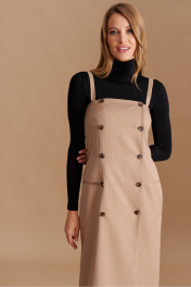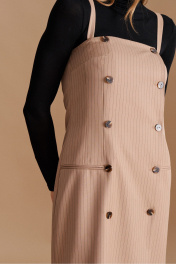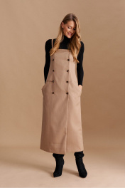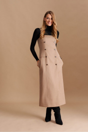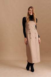 Сарафан женский на съёмных, регулируемых бретелях, приталенного силуэта из костюмно-плательной ткани, распашной, двубортный с застёжкой на петли и пуговицы спереди, длиной миди. Перед с талиевыми и нагрудными вытачками, порезными карманами в рамку-имитацией. В боковых швах оформлены функциональные карманы. Спинка с двумя парами талиевых вытачек, в которые вставлен хлястик, регулируемый пряжкой. Сарафан на подкладке.