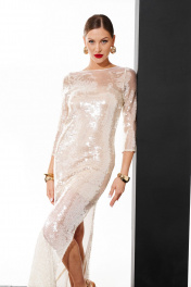 Платье женское на съемной подкладке. Верх платья - туника-сетка длиной макси. Рукав втачной длиной 3/4. Горловина округлой формы. Подкладка платья съемная, прилегающего силуэта из трикотажного полотна, без рукавов. Все швы обработаны окантовкой.