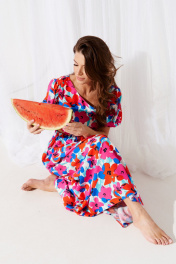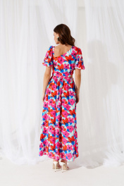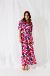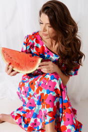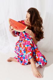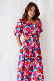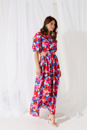 Платье , приталенное, расширенное к низу, без застежки, с фигурным вырезом горловины. Перед отрезной. С правой стороны на уровне талии — фигурный вырез, обработанный обтачками на резинке. Спинка отрезная. В боковых швах — карманы. Рукав втачной, короткий, собран на резинку по нижнему срезу.