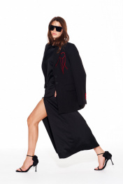 Платье из струящейся ткани с блеском, умеренного объема, прямого силуэта, с круглым вырезом горловины. Перед с нагрудными вытачками и фигурным подрезом. Нижняя часть переда с разрезом. Спинка со средним швом и застежкой на потайную тесьму-молнию. Рукав 3/4, втачной, одношовный.