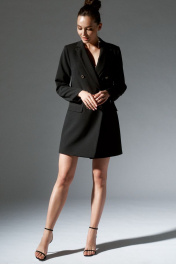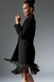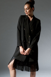 Платье-жакет двубортный с отстегивающейся по низу бахромой, женский, прямого силуэта, длинной до колена из костюмно-плательной ткани. Перед с нагрудными вытачками, прорезными карманами в рамку с клапаном, с застежкой на петли, пуговицы. Спинка с центральным швом. Рукав втачной, двухшовный, длинный. Вырез горловины обработан воротником пиджачного типа. Платье-жакет на подкладке. длина изделия - 83,5 см длина рукава - 60 см Размеры 42 44 46 48 50 52 обхват груди 90 94 98 102 106 110 обхват талии 88 92 94 98 102 106 обхват бедер 97 101 105 109 113 117 обхват рукава 30 32 34 36 39 41