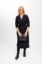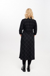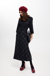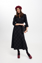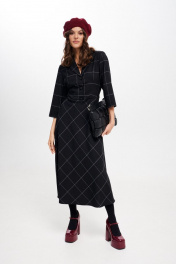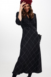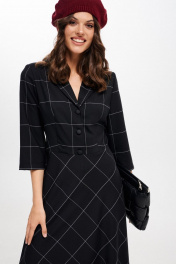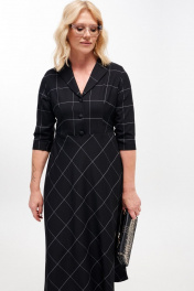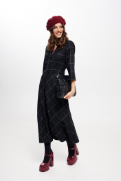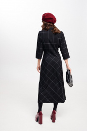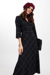 Платье женское, приталенного силуэта, длиной миди из костюмно-плательной ткани. Отрезное по линии талии. Лиф переда с талиевыми вытачками. Спинка лифа и юбки с талиевыми вытачками. Застежка лифа на петли, пуговицы. В левом боковом шве застежка на потайную молнию. Рукав втачной, одношовный, три четверти. Воротник отложной пиджачного типа. Крой юбки по косой. длина изделия - 126 см длина рукава - 43 см параметры 42 44 46 48 50 52 обхват груди 90 94 98 100 104 108 обхват талии 74 78 82 86 90 94 обхват бедер 114 118 122 126 130 134 обхват рукава 36 38 40 42 44 46