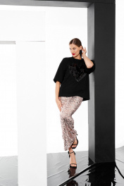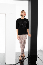Юбка женская, приталеного силуэта, длиной до линии щиколотки из трикотажного полотна в пайетки. Юбка без разреза, на подкладке до середины бедра. По поясу вставлена эластичная тесьма.