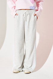 Брюки из трикотажного полотна свободного объема, прямого силуэта. В боковых швах расположены карманы. Пояс притачной на резинке. По поясу проложены отделочные строчки, образующие кулиску, в которую продет шнур-завязка с наконечниками. На правой задней половинке брюк накладной карман. Боковые швы, детали переда и спинки декорированы декоративной тесьмой.