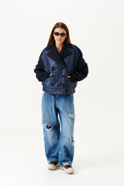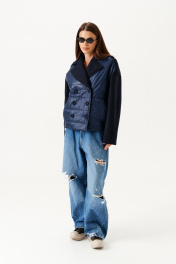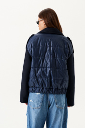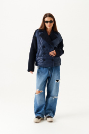 Куртка из различных материлов, прямого силуэта, со спущенной линией плеча, с центральной двубортной застежкой на петли и пуговицы, отложным воротником и лацканами пиджачного типа, на подкладке.В рельефах полочек расположены карманы. Низ спинки обработан притачным поясом на резинке. На верхней части рукава притачной погон с застежкой на прорезную петлю и пуговицу. Рукав двухшовный, длинный. Полочки и спинка из плащевой стеганной ткани с утеплителем изософт150г/м2. Воротник,лацканы, рукава, погоны из пальтовой ткани.