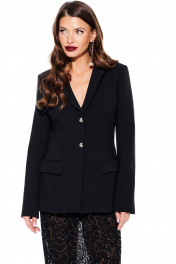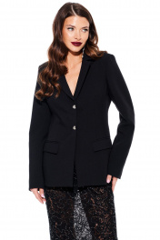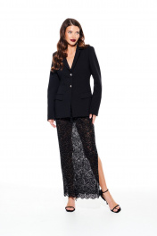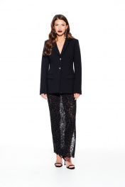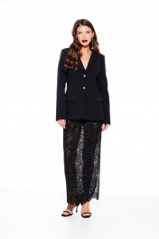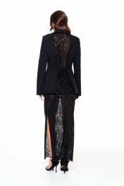 Жакет из костюмно-плательной ткани, умеренного объема, приталенного силуэта, однобортный, с центральной застежкой на 2 петли и 2 пуговицы, отложным воротником и лацканами пиджачного типа, на подкладке. Детали переда с талиевыми вытачками и прорезными карманами с клапаном и двумя обтачками. На левой полочке выполнен нагрудный карман в рамку. Спинка с вставкой из кружева на трикотажной основе в пайетки, на завязках. Рукав втачной, двухшовный, длинный.
