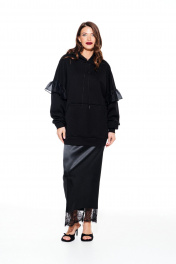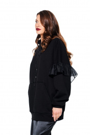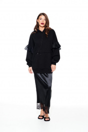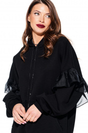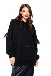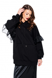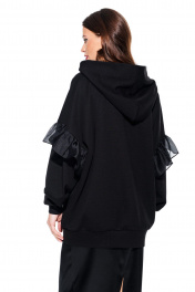 Толстовка из трикотажного полотна, свободного объема, прямого силуэта, с капюшоном. По переду выполнен накладной карман. Край кармана обработан декоративной тесьмой. Спинка цельная. Рукав втачной, длинный. Окат рукава оформлен воланом из органзы. По низу изделия и рукава притачные манжеты. Капюшон на обтачке и подкладке из органзы, через обметанные петли в кулиску продет декоративный нефункциональный шнур с металлическими наконечниками..
