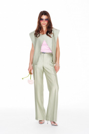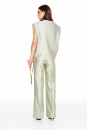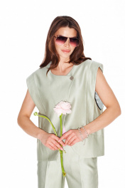 Жилетка из костюмно-плательной ткани, свободного объема, прямого силуэта, двубортная, с застежкой на петли и пуговицы, на подкладке. Детали переда с фигурными рельефами. Спинка отрезная, со средним швом и рельефами. Детали переда и спинки с декоративными планками в рельефах.