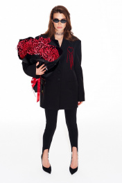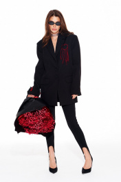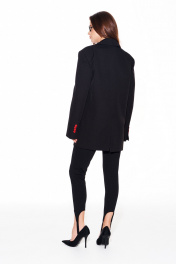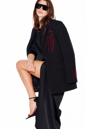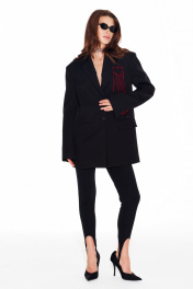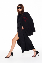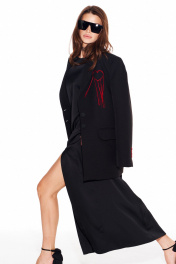 Жакет свободного объема, прямого силуэта, с центральной застежкой на 2 петли и 2 пуговицы, отложным воротником и лацканами пиджачного типа, на подкладке. Детали переда с талиевыми вытачками, отрезными бочками и прорезными карманами с клапанами и двумя обтачками. На левой полочке выполнена вышивка «Сердце». Спинка со средним швом, отрезными бочками и шлицей. Рукав втачной, двухшовный, длинный. В локтевых швах функциональные шлицы, застегивающиеся на 4 петли и 4 пуговицы.