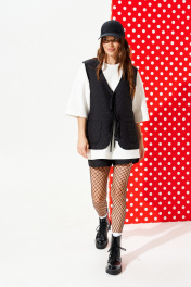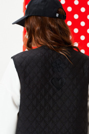 Жилетка из стеганой курточной ткани, свободного объема, прямого силуэта, с V-образным вырезом горловины. Детали переда с накладными карманами. Спинка цельная, с настрочными нашивками «Цветок» и «Сердце». Застежка центральная на завязках. Горловина, борт, рукава и низ жилетки обработаны окантовочной бейкой.