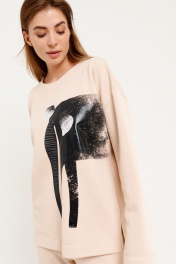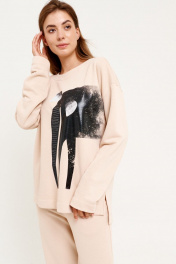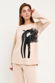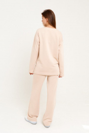 Комплект женский двухпредметный (джемпер+брюки) из трикотажной ткани. Джемпер женский, свободного силуэта, со спущенной линией плеча, длинным рукавом, удлиненной спинкой. Перед с декоративным нанесенным принтом. Круглый вырез горловины обработан обтачкой. Брюки прямые от бедра, верх брюк с цельнокроеным поясом на резинке. В боковых швах функциональные карманы с отрезным бочком. джемпер длина изделия - 70 см длина рукава от горловины - 72 см брюки длина изделия - 105 см Размеры 42 44 46 48 50 52 54 джемпер обхват груди 104 108 112 116 120 124 128 обхват талии 98 102 106 110 114 118 122 обхват бедер 98 102 106 110 114 118 122 обхват рукава 34 36 38 40 42 44 46 брюки обхват талии 64 68 72 76 80 84 88 обхват бедер 92 96 100 104 108 112 116