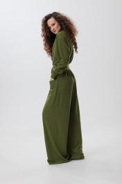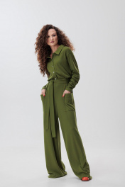 Комбинезон женский из трикотажного полотна, прямого силуэта, со спущенной линией плеча. Рукав втачной, одношовный, длинный. Спинка со средним швом. Перед с накладными карманами и удлинённой застёжкой "поло" на кнопки. Воротник стояче - отложной. В комплекте пояс из основной ткани. По низу комбинезона широкая подгибка, что позволяет регулировать длину.