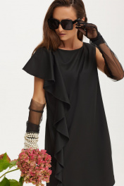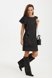 Платье женское прямого силуэта. Вырез горловины по переду - "лодочка", по спинке V-образный. По переду рельеф, и волан, переходящий в горловину по спинке. В боковых швах карманы.