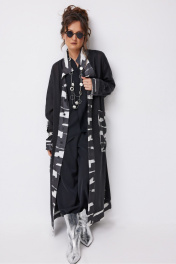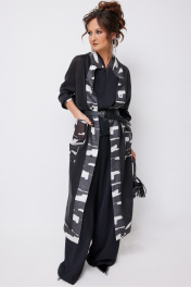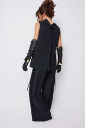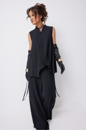 Комплект женский, состоящий из накидки, топа и брюк. Накидка прямого силуэта со спущенной линией плеча, рукав одношевный втачной длинный, заканчивающейся притачной манжетой. Воротник-стойка. Спинка со средним швом, в который вставлен декоративные элементы. Перед с декоративной центральной планкой на кнопки и накладными карманами со складками. В боковых швах разрезы, низ переда спинки и разреза оформлены декоративными планками. Топ А-образного силуэта, по спинке воротник-цельнокроенная стойка с вырезом по переду, по переду и спинке декоративные элементы, низ разноуровневый, в боковых швах окантованные разрезы и шнурки. Брюки прямого силуэта типа "палаццо", передняя часть с боковыми карманами и имитацией застежки-гульфик, пояс притачной с резинкой по боковым и задним частям. В комплекте есть ремень.