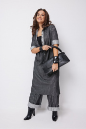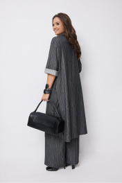 Комплект женский, состоящий из туники и брюк. Туника прямого силуэта, по переду планка-поло с застежкой на декоративные кнопки. Воротник рубашечного типа, рукав втачной длинной 3/4. В боковых швах высокие разрезы. Брюки прямого силуэта, передняя часть с боковыми карманами, задняя часть с вытачками. Застежка на молнию, петлю пуговицу, пояс притачной со шлевками и резинкой по боковой и задней частям. В комплекте используется двухлицевая ткань, что позволяет регулировать длину рукава.
