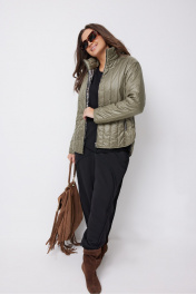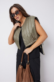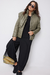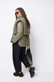 Комплект женский, состоящий из куртки, жилета и брюк. Куртка прямого силуэта, со спущенной линией плеча, рукава втачные длинные, воротник-стойка, застежка на тесьму молнию, на передней части расположены карманы с тесьмой молнией, куртка фигурными разрезами в боковых швах, край борта, низ куртки и низ рукавов окантованы. Жилет: свободной формы с круглой горловиной с застежкой молнией, низ жилета выполнен ввиде кулисы, край борта, горловины и проймы окантованы, на спинке жилета расположена настрачная декоративная нашивка. Брюки свободной формы (бананы) на притачном поясе с резинкой и декаротивным шнуром, брюки с заниженной линией сидения, в боковых швах карманы, на задней части брюк с левой стороны декоративный накладной карман, перед с фигурными авторскими рельефами, рельефы переда и боковые швы с открытым срезом.
