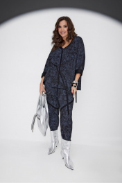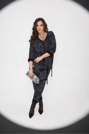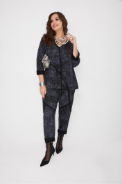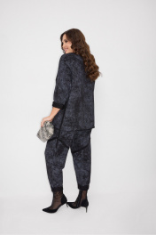 Комплект женский, состоящий из блузона и брюк. Блузон прямого силуэта со спущенной линией плеча. Рукав одношовный, длинный, заканчивающийся открытым срезом. Вырез горловины V-образный, с притачной планкой и декоративным элементом из основной ткани. Перед с асимметричными подрезами и декоративными элементами. Низ блузона выполнен открытым срезом. Брюки свободного силуэта, заужены к низу. Пояс притачной, с резинкой. Перед брюк с боковыми карманами. Брюки с фигурными подрезами. Подрезы и низ брюк выполненными швами с открытыми срезами. Размер 50: Свитшот: ОГ-124, ОТ-124, ОБ-124, ширина плеча-17, длина рукава втачного-57, ширина рукава на уровне низа-14.5,длина изделия спинки-67. Брюки: ОТ в собр.-66, ОТ в раст.-112 ОБ-112, длина изделия по боковому шву с поясом-98 Размер 52: Свитшот: ОГ-128, ОТ-128, ОБ-128, ширина плеча-17, длина рукава втачного-57, ширина рукава на уровне низа-14.5,длина изделия спинки-67. Брюки: ОТ в собр.-70, ОТ в раст.-116, ОБ-116, длина изделия по боковому шву с поясом-98 Размер 54: Свитшот: ОГ-132, ОТ-132, ОБ-132, ширина плеча-17, длина рукава втачного-57, ширина рукава на уровне низа-14.5,длина изделия спинки-67. Брюки: ОТ в собр.-74, ОТ в раст.-120, ОБ-120, длина изделия по боковому шву с поясом-98