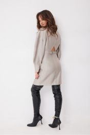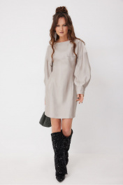Платье женское, полуприлегающего силуэта, по переду фигурный подрез, рельефы и накладной карман. Верхняя часть спинки на запах, нижняя часть со средним швом, вытачками и втачным поясом. Застежка платья на потайную молнию в среднем шве и поясом с полукольцами, который позволяет регулировать прилегание в области талии. Вырез горловины "лодочка". Линия плеча спущена. Рукав втачной, объемный, со швами, шлицей притачной манжетой. Промеры: Размер 42: ОГ-96, ОТ-74, ОБ-101, ширина рукава на уровне ОП-25, длина рукава втачного-51, ширина рукава по низу-11,5, ширина плеча-21,5, длина изделия спинки по центру-87. Размер 44: ОГ-100, ОТ-78, ОБ-105, ширина рукава на уровне ОП-25, длина рукава втачного-51, ширина рукава по низу-11,5, ширина плеча-22,5, длина изделия спинки по центру-87. Размер 46: ОГ-104, ОТ-82, ОБ-109, ширина рукава на уровне ОП-25, длина рукава втачного-51, ширина рукава по низу-11,5, ширина плеча-23,5, длина изделия спинки по центру-87.