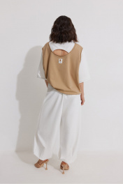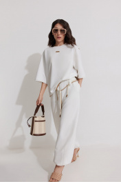 Комплект женский, состоящий из свитшота и брюк, выполненный из трикотажного полотна. Свитшот оверсайз со спущенной линией плеча. Рукав втачной одношовный короткий. Вырез горловины круглый, низ рукава и горловины обработан планкой с открытым срезом. Спинка двойная с имитацией майки. Низ свитшота с притачной планкой и открытым срезом. Брюки свободные, прямого силуэта, на притачном поясе с резинкой. Карманы боковые. По низу брюк кулиса, чтобы можно было создать форму "Алладины". Брюки со шлевками и декоративным съемным поясом Размер 44: Свитшот: ОГ-122, ОТ-118, ширина изделия по линии низа-52, ширина плеча-18, длина рукава втачного-30, ширина рукава на уровне низа-20.5, длина изделия спинки-64; Брюки: ОТ в собр.-68, ОТ в раст.-98, ОБ-108, длина изделия по боковому шву с поясом -108. Размер 46: Свитшот: ОГ-126, ОТ-122, ширина изделия по линии низа-54, ширина плеча-19, длина рукава втачного-30, ширина рукава на уровне низа-20.5, длина изделия спинки-64; Брюки: ОТ в собр.-72, ОТ в раст.-102, ОБ-112, ширина изделия по низу-24, длина изделия по боковому шву с поясом -108. Размер 48: Свитшот: ОГ-130, ОТ-126, ширина изделия по линии низа-56, ширина плеча-20, длина рукава втачного-30, ширина рукава на уровне низа-20.5, длина изделия спинки-64; Брюки: ОТ в собр.-68, ОТ в раст.-98, ОБ-108, ширина изделия по низу-27, длина изделия по боковому шву с поясом -108. Размер 50 Свитшот: ОГ-134, ОТ-130, ширина изделия по линии низа-58, ширина плеча-21, длина рукава втачного-30, ширина рукава на уровне низа-20.5, длина изделия спинки-64; Брюки: ОТ в собр.-72, ОТ в раст.-110, ОБ-120, ширина изделия по низу-30, длина изделия по боковому шву с поясом -108.