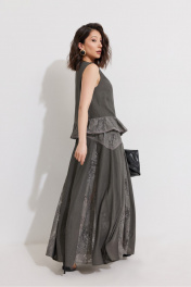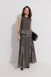 Комплект женский состоящий из блузы и юбки. Блуза прямого силуэта без рукава. Застежка на навесные петли и пуговицы. По переду вытачки. По низу притачная деталь со сборкой из гипюра с тесьмой. Юбка А-образного силуэта с фигурной кокеткой по переднему и заднему полотнищу и клиньями из гипюра. Верх юбки с притачной кулисой со шнуром и резинкой. Юбка на хлопковой подкладке. Размер 44: Блуза: ОГ-96, ОТ-98, ширина плеча-8, ширина изделия спинки-37, длина изделия спинки по центру-54. Юбка: От в собр.-64, ОТ в раст.-98, длина изделия по боковому шву с кулисой-98. Размер 46: Блуза: ОГ-100, ОТ-102, ширина плеча-8, ширина изделия спинки-37, длина изделия спинки по центру-54. Юбка: От в собр.-68, ОТ в раст.-102, длина изделия по боковому шву с кулисой-98. Размер 48: Блуза: ОГ-104, ОТ-106, ширина плеча-8, ширина изделия спинки-37, длина изделия спинки по центру-54. Юбка: От в собр.-72, ОТ в раст.-106, длина изделия по боковому шву с кулисой-98.