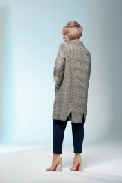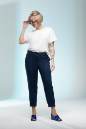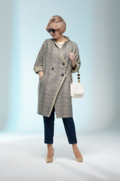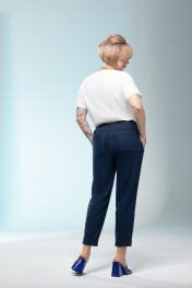 Комплект женский, состоящий из сюртука и брюк. Комплект состоит из двух видов ткани. Сюртук прямого, зауженного к низу силуэта, со спущенной лининей плеча. По переду карманы, листочки, ассиметричная застёжка на петли и пуговицы. Спинка с рельефами, заканчивающимися разрезами. Воротник - цельнокроеная стойка. Рукав втачной, полной длины, с манжетой - что позволяет регулировать длину. Сюртук без подкладки, с окантованными срезами. Брюки прямого, зауженного к низу силуэта. Передняя часть с накладными карманами и застёжкой на молнию, петлю и пуговицу. Задняя часть брюк с кокеткой и карманами. Пояс притачной со шлёвками, по задней части на резинке. Размер 52: сюртук: ОГ 142, ОТ 128, ОБ 122, ширина плеча 37, длина рукава втачного 31, ширина рукава на уровне ОП 19,5, ширина рукава на урвоне низа 18, длина изделия спинки 100; брюки: ОТ 86-106, ОБ 114, ширина изделия по низу 17, длина изделия по боковому шву с поясом 100 Размер 54: сюртук: ОГ 146, ОТ 132, ОБ 126, ширина плеча 38, длина рукава втачного 31, ширина рукава на уровне ОП 19,5, ширина рукава на урвоне низа 18, длина изделия спинки 100; брюки: ОТ 88-110, ОБ 118, ширина изделия по низу 17, длина изделия по боковому шву с поясом 100 Размер 56: сюртук: ОГ 150, ОТ 136, ОБ 130, ширина плеча 39, длина рукава втачного 31, ширина рукава на уровне ОП 19,5, ширина рукава на урвоне низа 18, длина изделия спинки 100; брюки: ОТ 90-114, ОБ 122, ширина изделия по низу 17, длина изделия по боковому шву с поясом 100