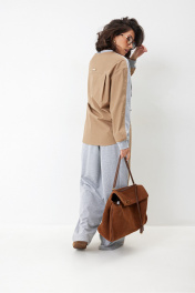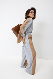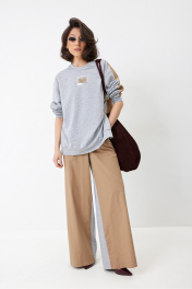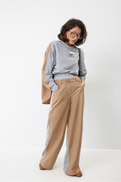 Комплект женский, состоящий из свитшота и брюк, выполненные из двух видов ткани: мягкого трикотажа 2-нитка и хлопка. Свитшот прямого силуэта, оверсайз со спущенной линией плеча, длинным втачным рукавом, завершенным манжетой. Спинка с горизонтальной кокеткой и складками по нижней части, а низ с фигурным краем. Передняя часть свитшота с притачной планкой по низу и разрезами в боковых швах. Горловина круглая и обработана планкой. Брюки широкие, прямого силуэта на притачном поясе с резинкой. Задняя часть брюк с накладными карманами, а передняя включают дизайнерский элемент — имитацию джинсовых швов, придающих образу стили ретро и современности. На свитшоте и в области переда брюк расположены декоративные нашивки. Размер 42: Свитшот: ОГ-122, ОТ-120, ширина изделия по низу-58, ширина плеча-18, длина рукава втачного с манжетой-55, ширина рукава на уровне ОП-23, ширина изделия спинки-47, длина изделия спинки-73. Брюки: ОТ в собр.-66, ОТ в раст.-96, ОБ-106, ширина изделия по низу-31, длина изделия по боковому шву с поясом-110. Размер 44: Свитшот: ОГ-126, ОТ-124, ширина изделия по низу-60, ширина плеча-19, длина рукава втачного с манжетой-55, ширина рукава на уровне ОП-23, ширина изделия спинки-49, длина изделия спинки-73. Брюки: ОТ в собр.-70, ОТ в раст.-100, ОБ-110, ширина изделия по низу-32, длина изделия по боковому шву с поясом-110. Размер 46: Свитшот: ОГ-130, ОТ-128, ширина изделия по низу-62, ширина плеча-20, длина рукава втачного с манжетой-55, ширина рукава на уровне ОП-23, ширина изделия спинки-51, длина изделия спинки-73. Брюки: ОТ в собр.-74, ОТ в раст.-104, ОБ-114, ширина изделия по низу-33, длина изделия по боковому шву с поясом-110. Размер 48: Свитшот: ОГ-134, ОТ-132, ширина изделия по низу-64, ширина плеча-21, длина рукава втачного с манжетой-55, ширина рукава на уровне ОП-23, ширина изделия спинки-53, длина изделия спинки-73. Брюки: ОТ в собр.-78, ОТ в раст.-108, ОБ-118, ширина изделия по низу-35, длина изделия по боковому шву с поясом-110.