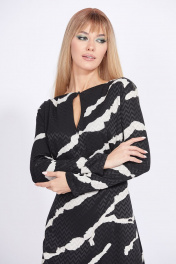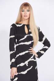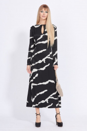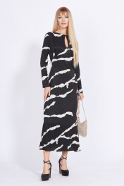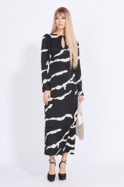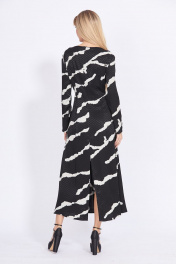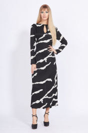 Платье выполнено из плательной ткани с абстрактным принтом. Платье полуприлегающего силуэта, с отрезной завышенной линией талии, длиной миди. Спереди в среднем шве прорезь "капля". Застежка на потайную молнию в среднем шве спинки. Плечевой шов слегка спущен. Рукав втачной, одношовный. Юбка расширена к низу. Сзади разрез в среднем шве. Платье на отлетной по низу подкладке. Длина платья: р.44-48 - 131 см, р.50-54 - 132,5 см. Длина рукава: р.44-48 - 69 см, р.50-54 - 70 см. 44 46 48 50 52 54 Длина по центру спинки 131 131 131 132,5 132,5 132,5 Длина рукава 69 69 69 70 70 70 Объем по груди 96 100 104 108 112 116 Объем по талии 76 80 84 88 92 96 Объем по бедрам 104 108 112 116 120 124 Объем по низу 166 170 174 178 182 186 Объем рукава вверху 31 33 35 35 37 39 Объем рукава внизу 22 22 22 23,5 23,5 23,5