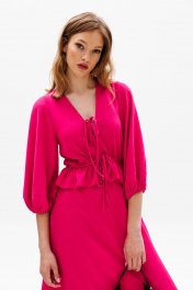 Платье выполнено из плательной ткани. Платье Х-образного силуэта, длиной миди, отрезное по линии талии. Горловина V-образной формы с завязками. На спинке в среднем шве застежка на потайную молнию. Плечевой шов укорочен. Рукав втачного покроя, одношовный, длиной 3/4 с вытачками по окату. Рукав расширен к низу, присборен на эластичную тесьму. Юбка расширена к низу. На заднем полотнище средний шов. В левом боковом шве обработан разрез. Длина платья: р. 42, 44, 46 - 140 см, 48-54 - 141 с Длина рукава: р. 42, 44, 46 - 48 см, р. 48-52 - 49 с 42 44 46 48 50 52 Длина по центру спинки 140 140 140 141 141 141 Длина рукава 48 48 48 49 49 49